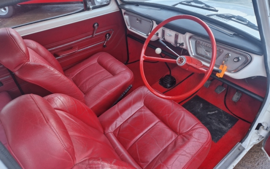 Interior - Upgraded red front seats with matching red rears and door cards. Red steering wheel and steering cowling. Red carpets. Tidy little car inside