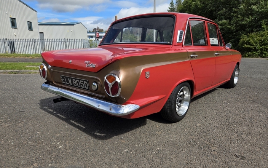 Body - MK1 Cortina GT shell with tramp bar brackets intact. The car is solid underneath currently and is painted body colour. There is evidence of repairs over the years in the usual places, which are visible. You can see exactly whats been done as its not hiding under gallons of underseal. Underbonnet area has recently been refreshed and is very tidy. Boot area is good and solid. Paintwork is showing its age a bit. Its perfectly useable but if you wanted a show car youd need to update the paintwork. Bubbling on the bottom of 3 of the doors and evidence of previous repairs in these areas as well as the bottoms of wings. Not uncommon for a near 60 year old car, by any means. Gold flash is a decal rather than painted. Good quarter bumpers, grille, mirrors.