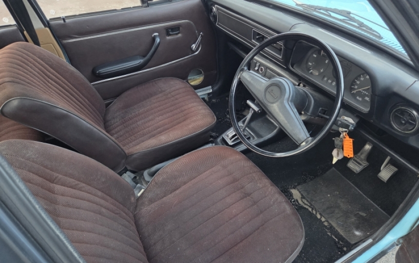 Interior - Brown cloth seats which are perfectly useable. Front seats are good. Rear have some sun damage on top. Front door cards have speaker holes. Carpet is worn through. Headlining is good, dashtop has a crack.