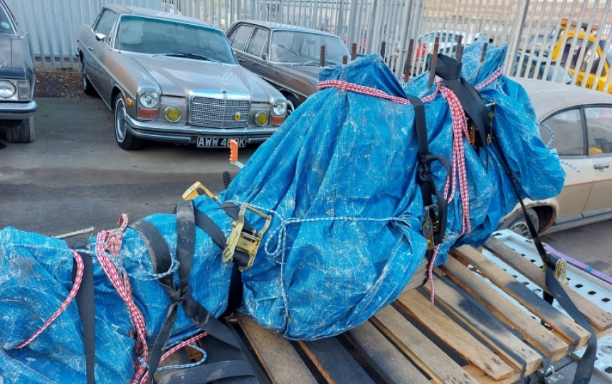 This is the 4 door saloon version. Very solid underneath. Chassis looks untouched. The sunroof panel and other wheel arch extension is in the car. The car is full of parts a lot of them look new and boxed. The engine and gearbox are removed from the car and are separate. The heads are not on the engine but we think they are in the car but need to pull all the stuff out to check.